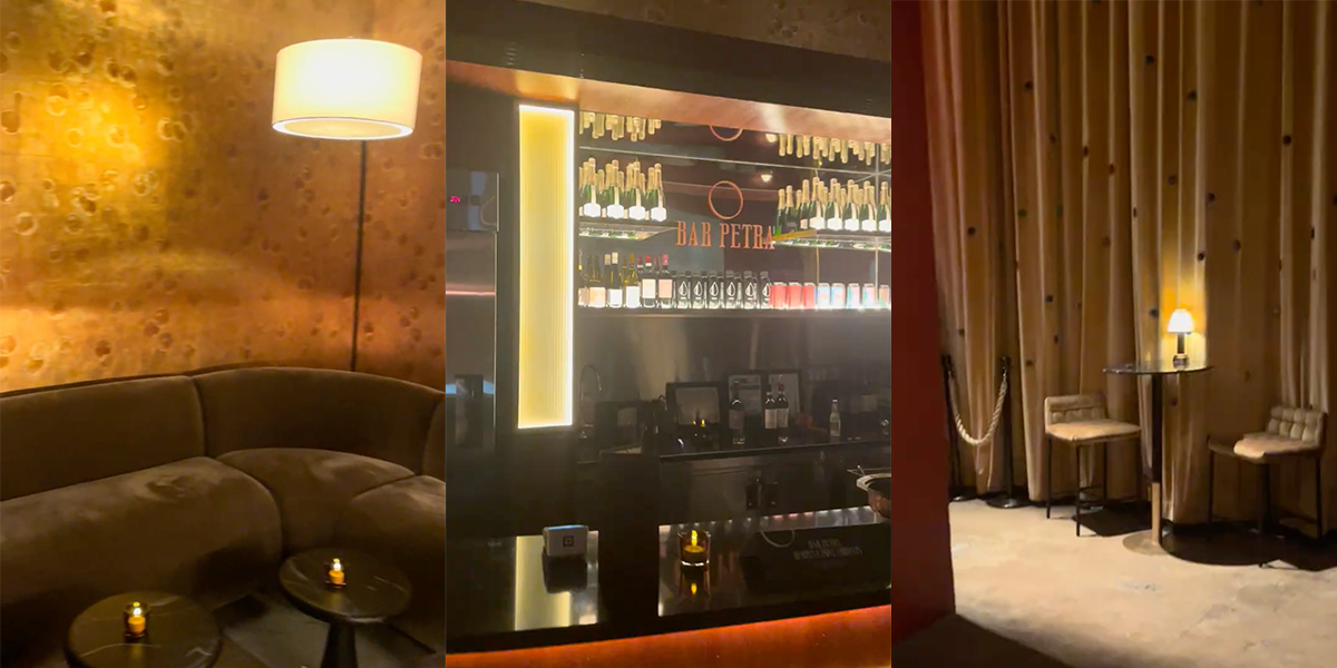 The new Bar Petra, which serves curated wines, craft beer, and soft drinks, is surrounded by wallpaper with a golden hue. Pask added bar tables in the walkway from the lounge to the performance space, and other decorative touches reference the building’s 1927 origins as a bank.